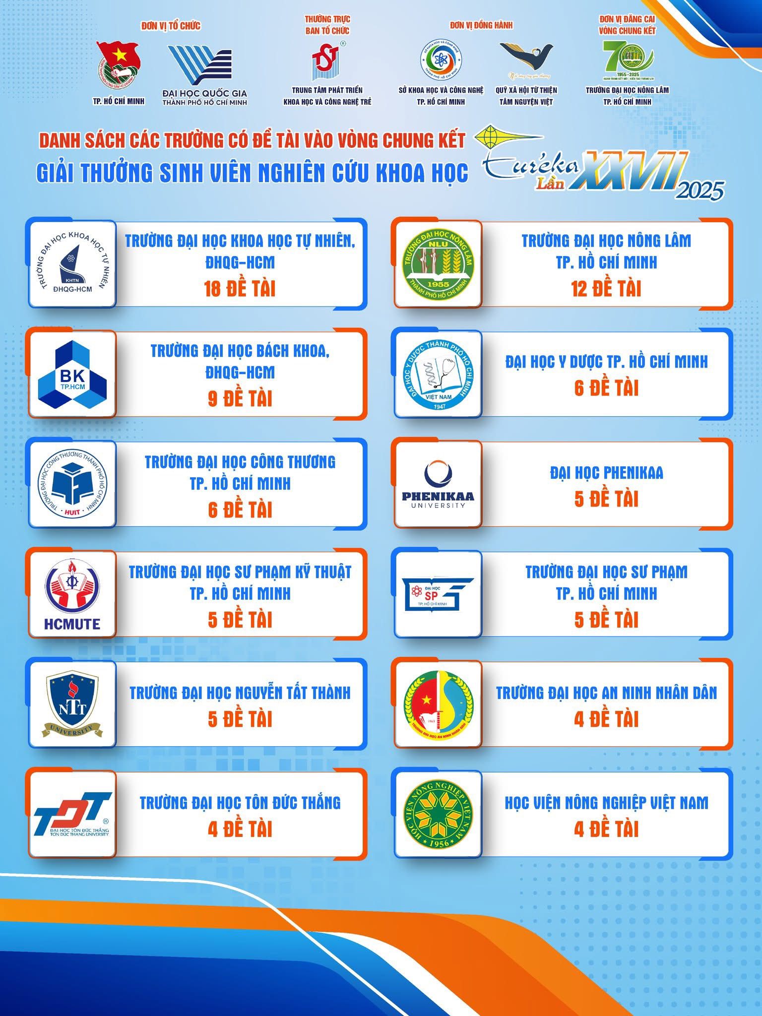 Vòng Chung kết Giải thưởng Sinh viên Nghiên cứu khoa học Euréka năm 2025 diễn ra từ ngày 04/12/2025 đến ngày 07/12/2025 tại Trường Đại học Nông Lâm TP. Hồ Chí Minh.